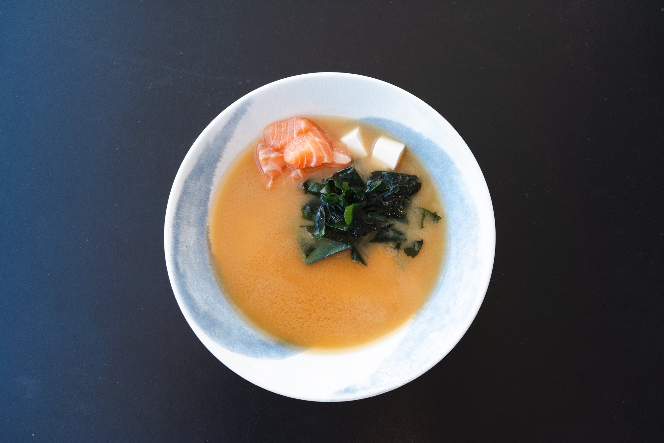 zupa miso z łososiem, z tofu oraz glonami wakame