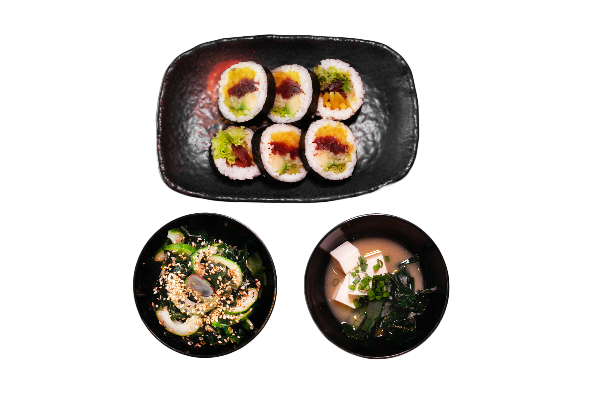 Zestaw lunchowy: Zupa Misoshiru, Sałatka z wodorowstów i ogórka, Futomaki Vege 6 szt. (serek philadelphia, sałata, ogórek, avocado, tykwa, oshinko)