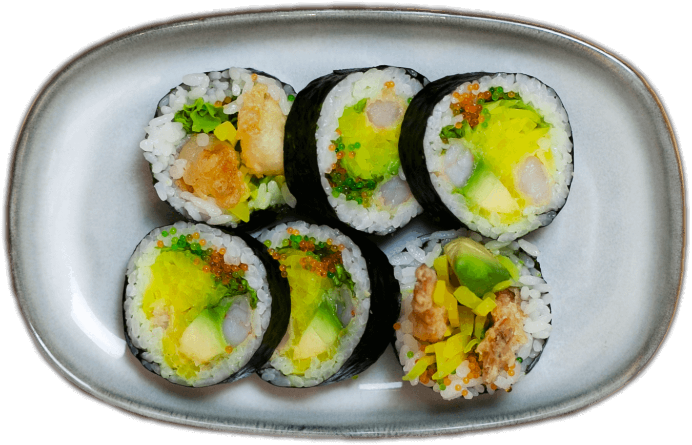 Zestaw lunchowy: Zupa Misoshiru, Sałatka z wodorostów i ogórka, Futomaki Ebi ten 6szt. (krewetka w tempurze, pikantny majonez, oshinko, sałata, awokado, )